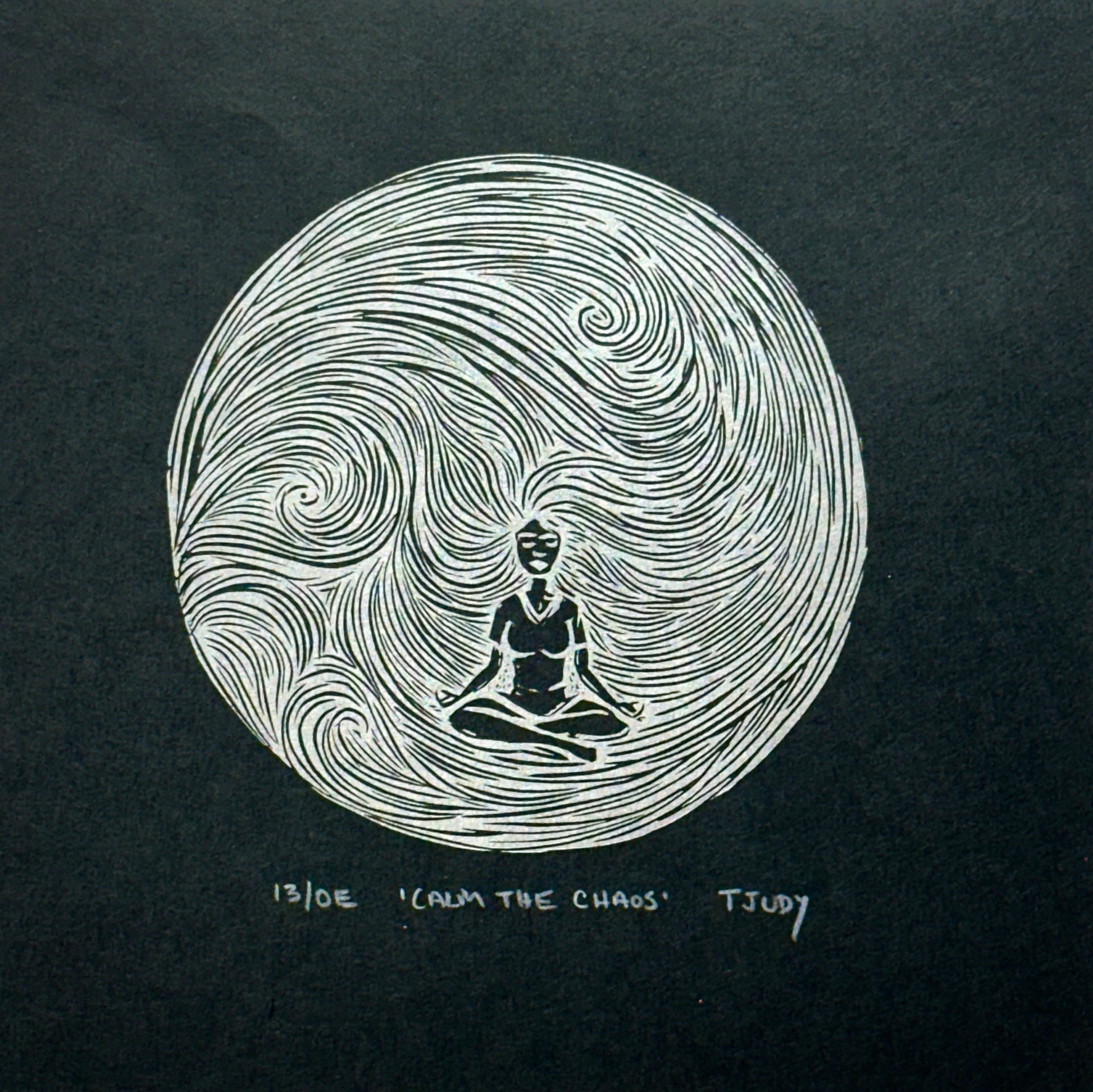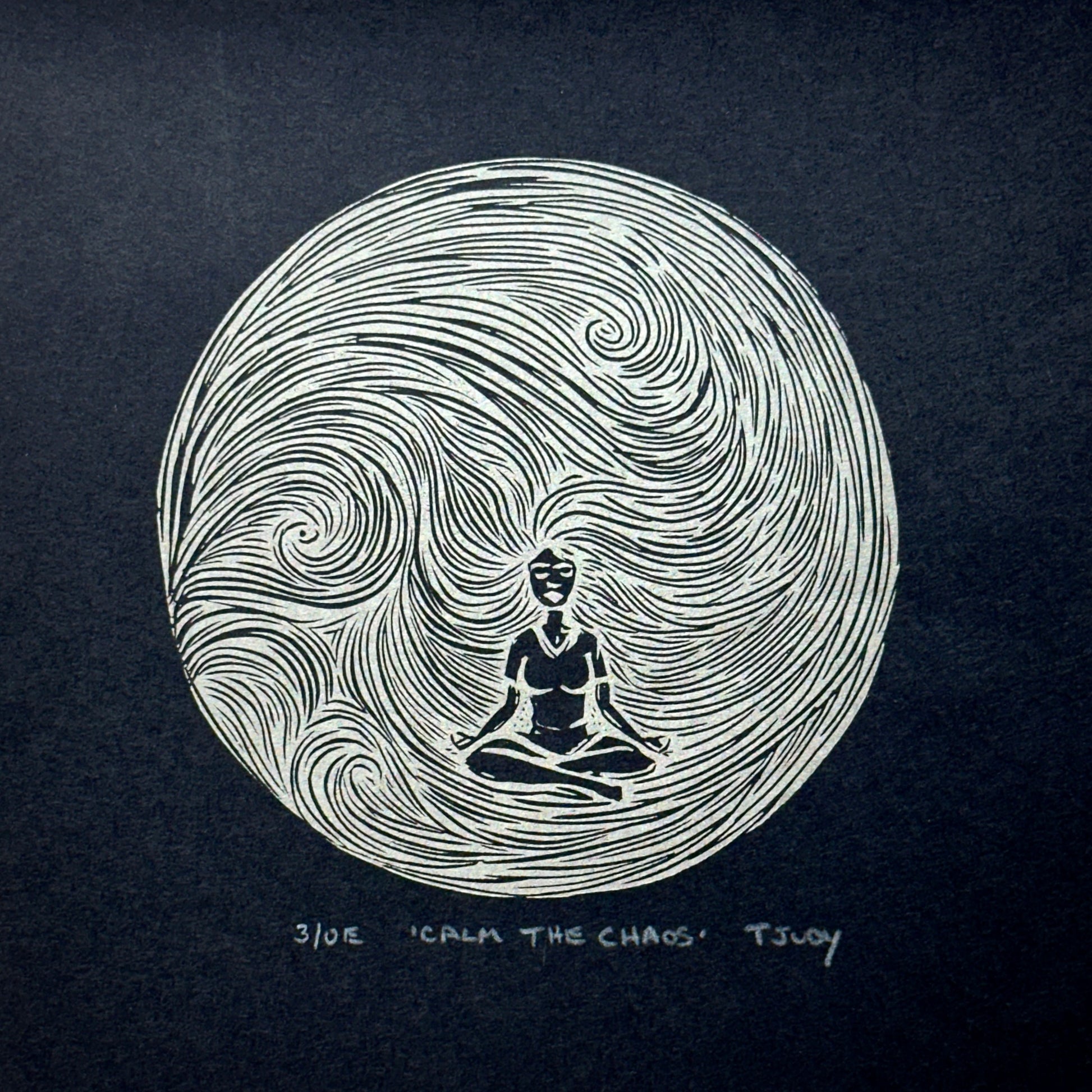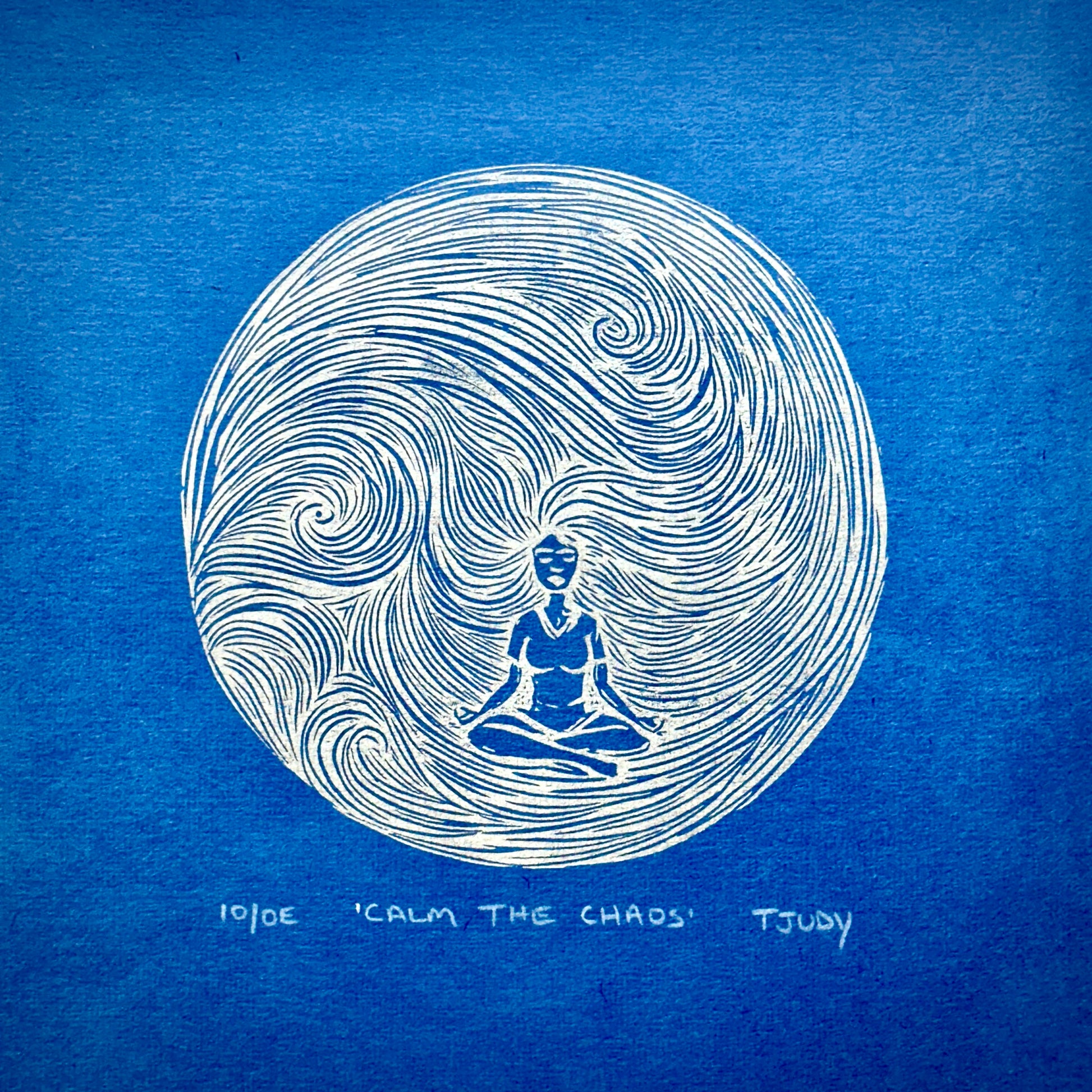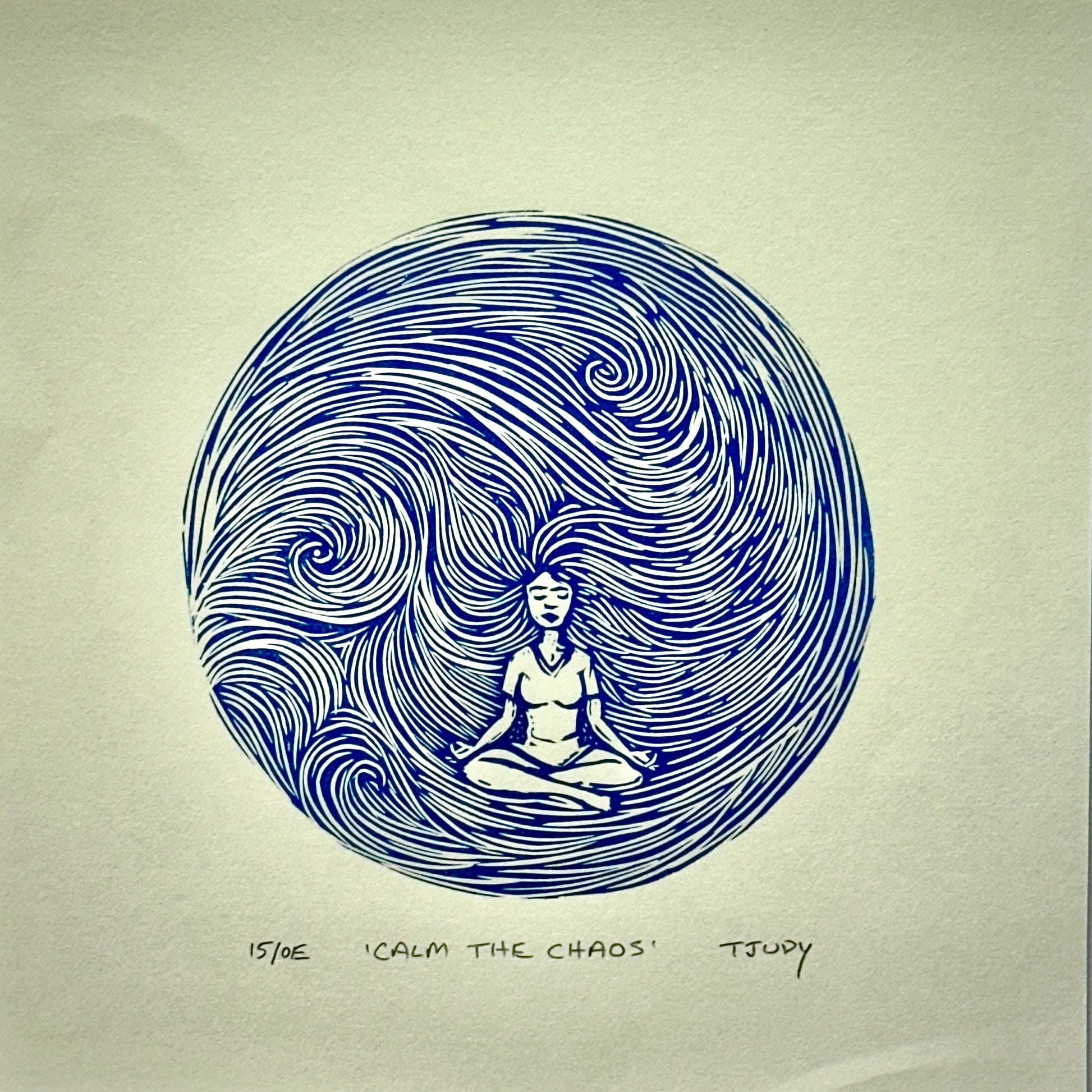 I designed this linocut for a print exchange with some other printers, mostly in England. the theme for this this exchange is 'Chaos/Calmness'. The first thing that pops into my head for 'chaos' is a hurricane... it's a Florida thing. The first thing that pops in my head for 'calmness' is quiet meditation. The orginal limited edition was very popular and sold out quickly, so I decided to create an open edition using the same block, but variable in ink and paper color.
