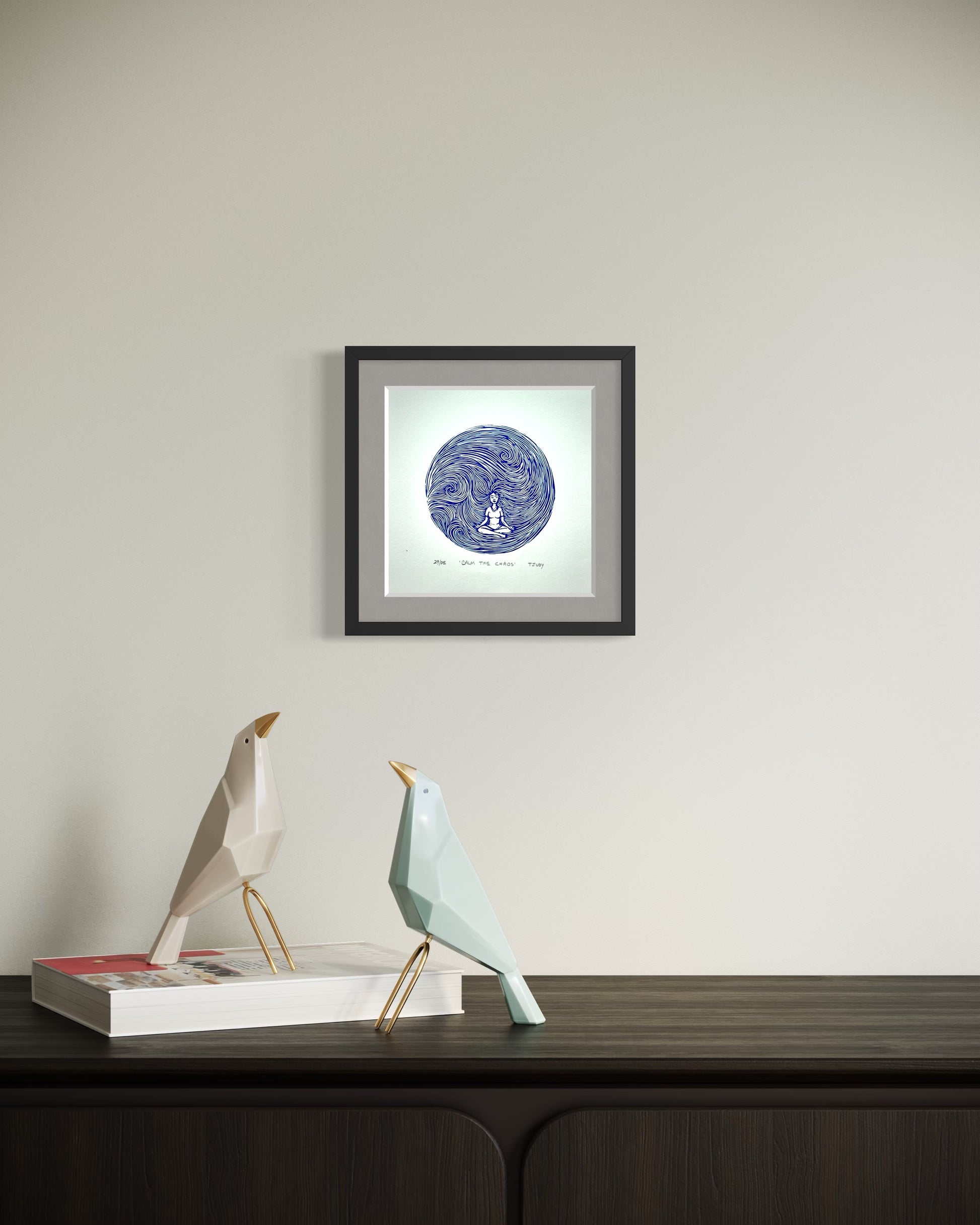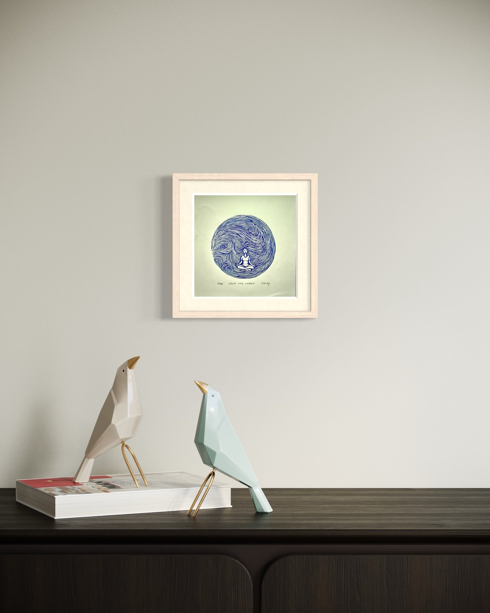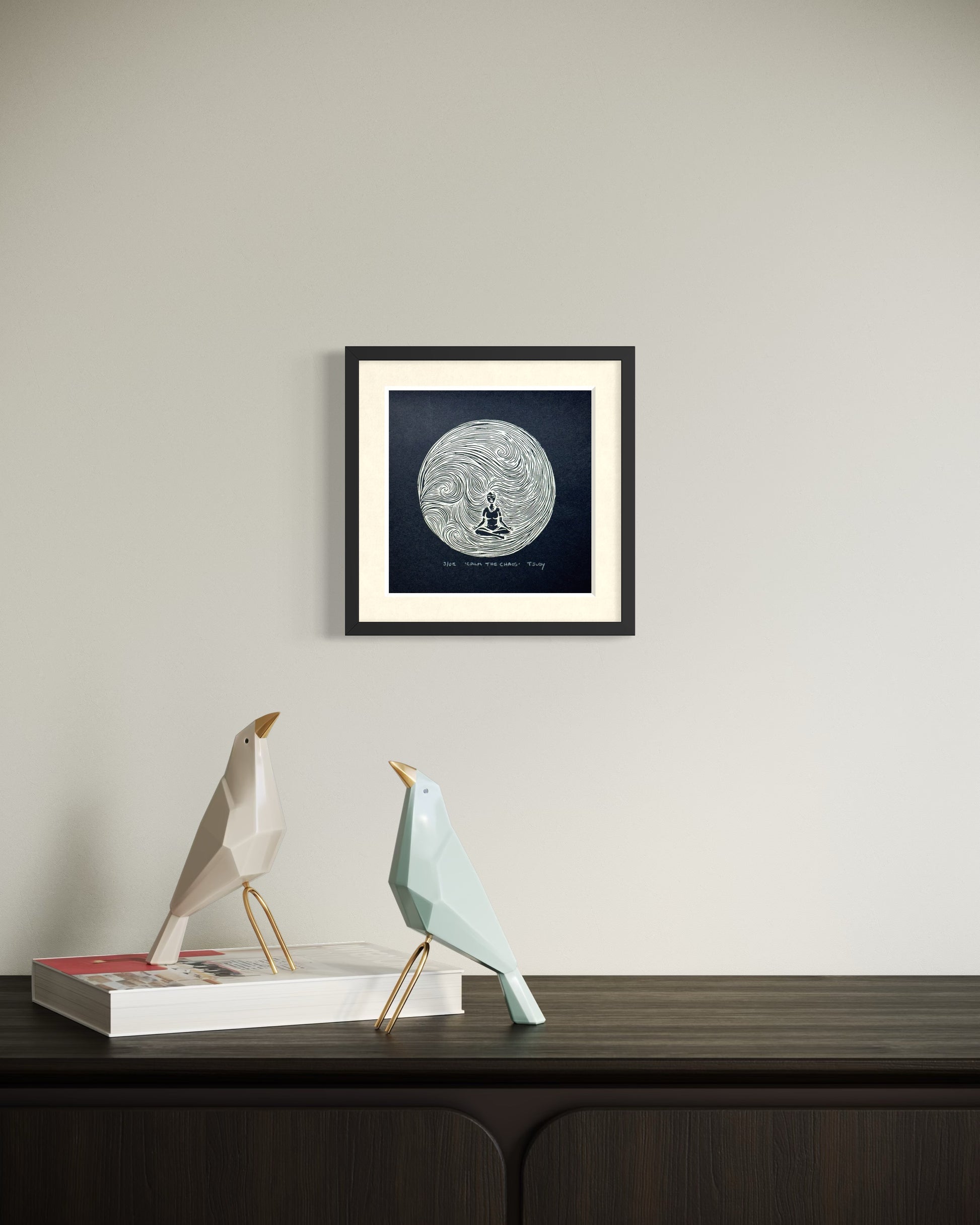 I designed this linocut for a print exchange with some other printers, mostly in England. the theme for this this exchange is 'Chaos/Calmness'. The first thing that pops into my head for 'chaos' is a hurricane... it's a Florida thing. The first thing that pops in my head for 'calmness' is quiet meditation. The orginal limited edition was very popular and sold out quickly, so I decided to create an open edition using the same block, but variable in ink and paper color.