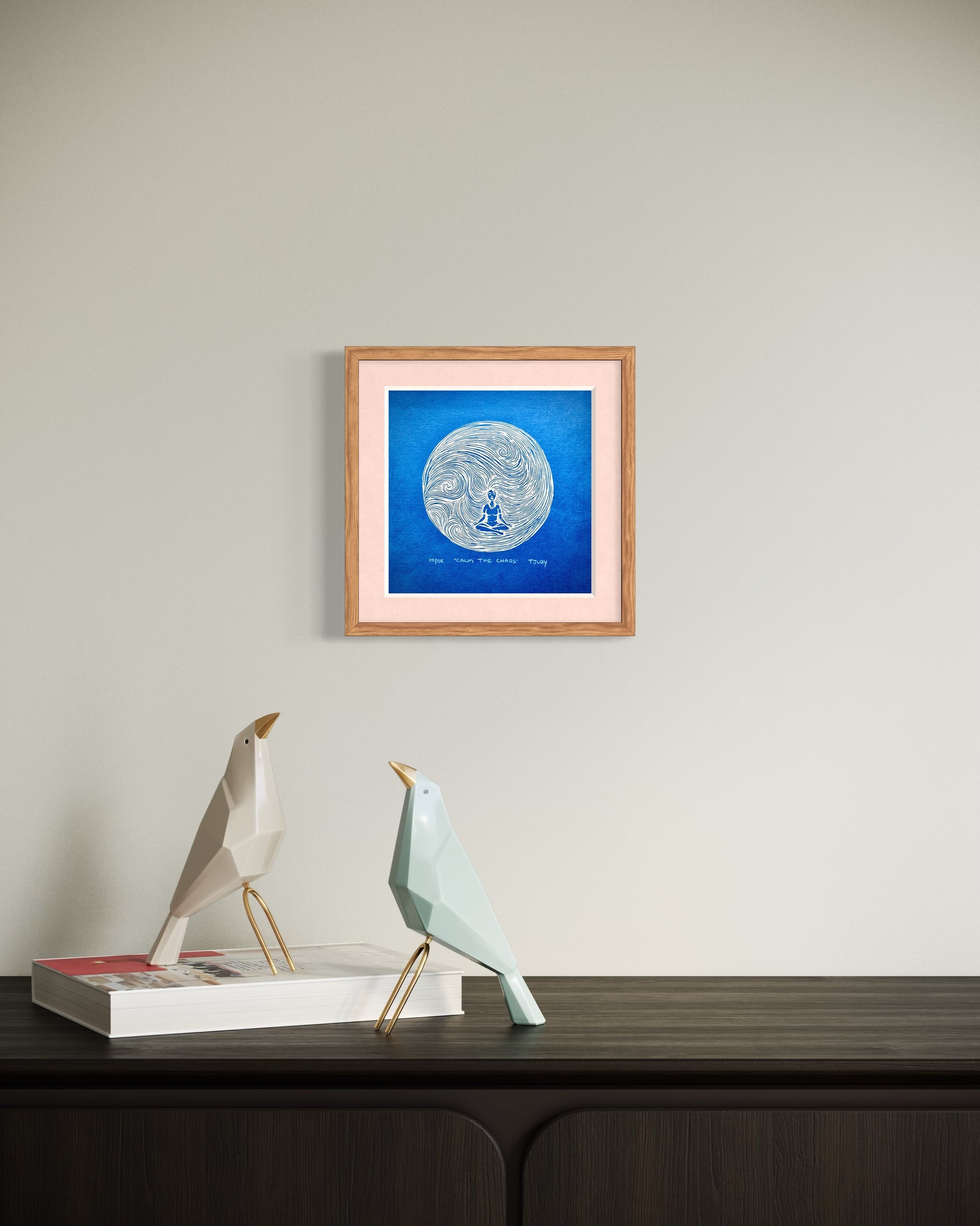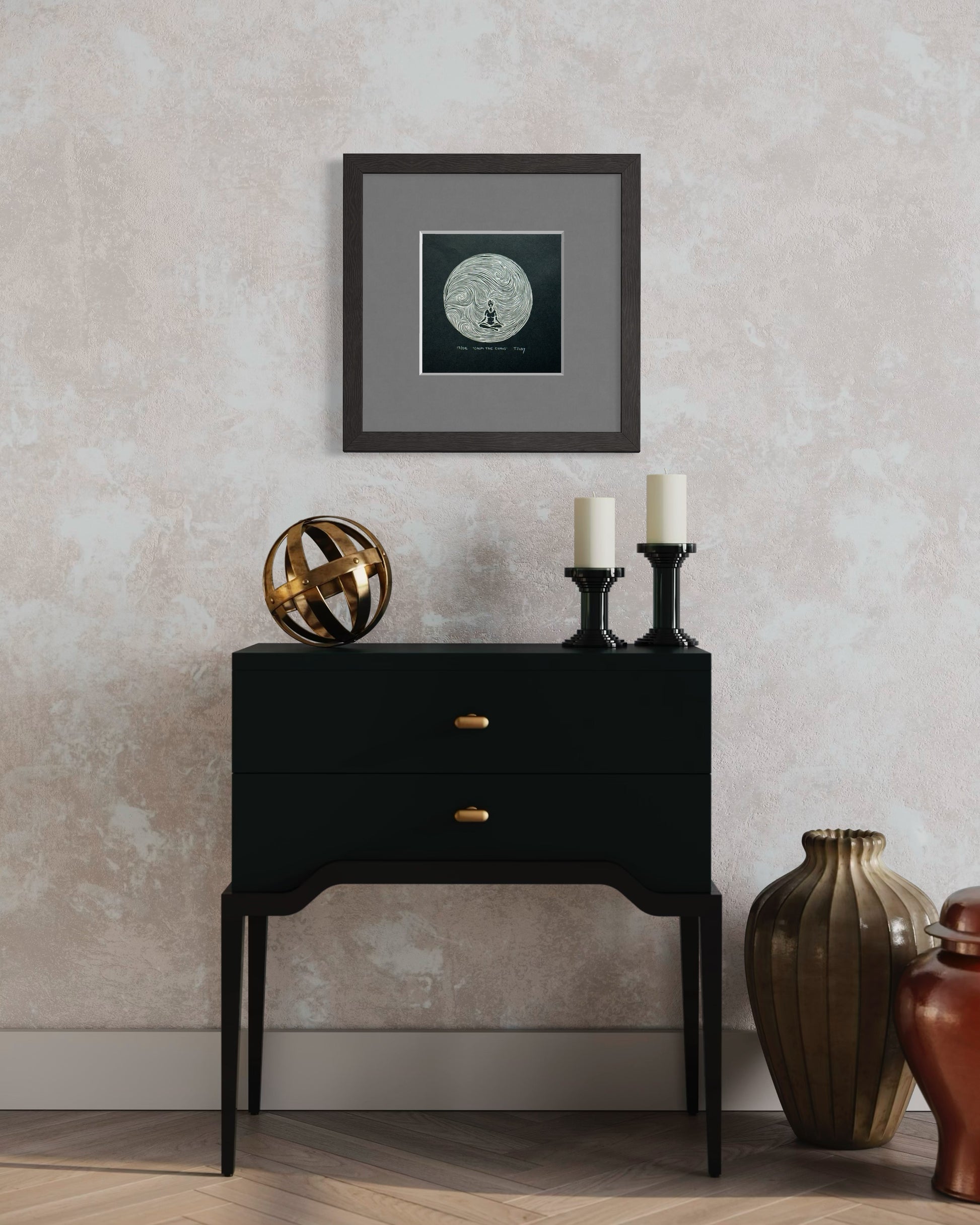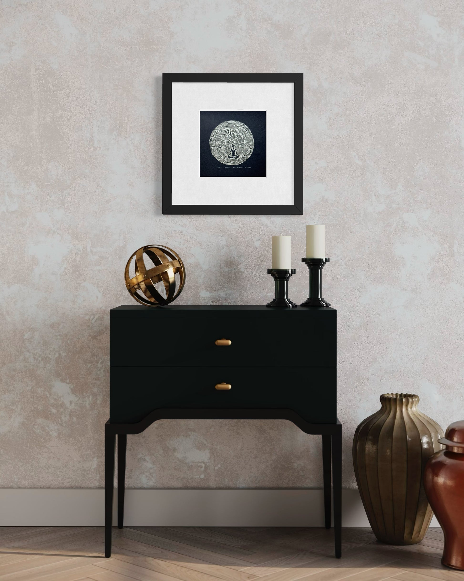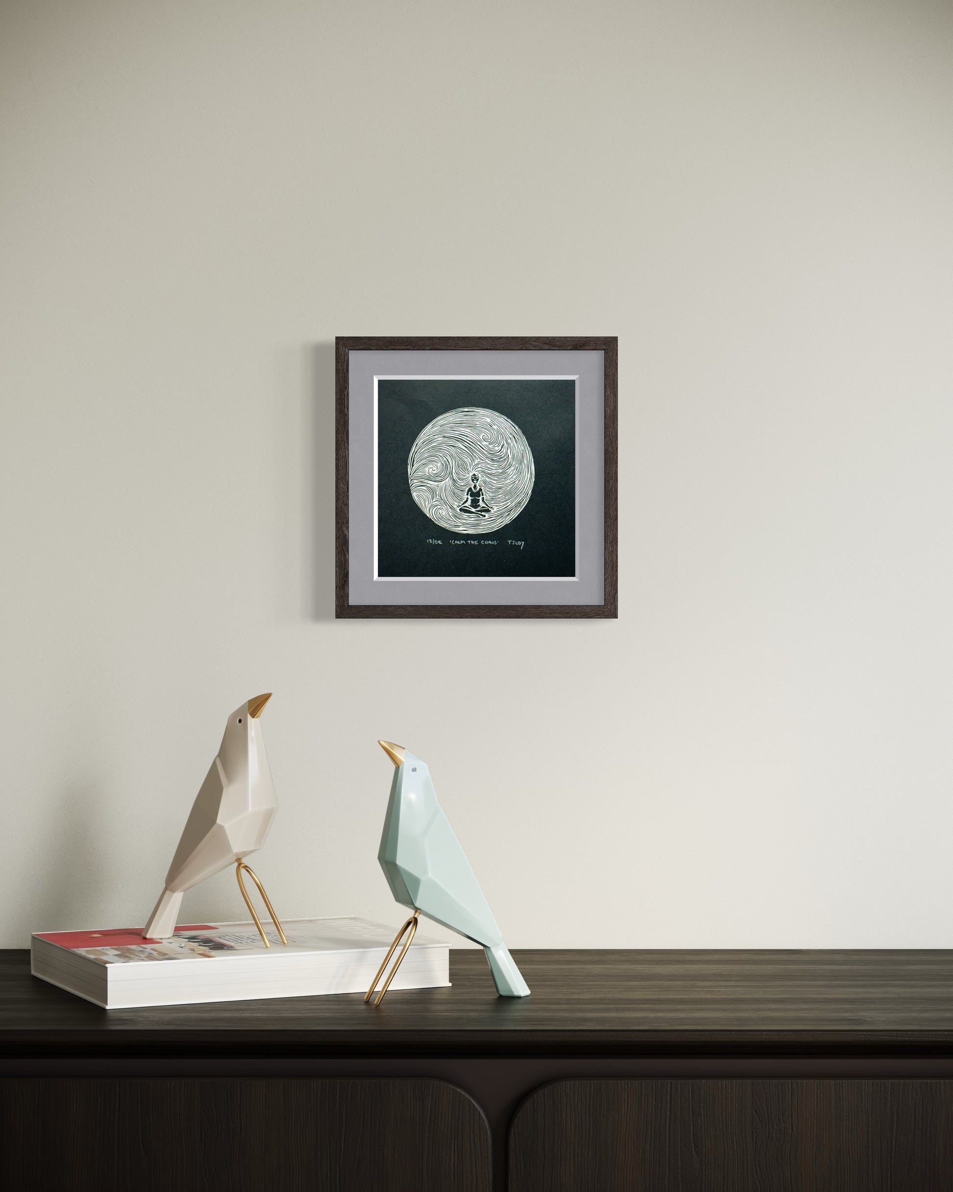 I designed this linocut for a print exchange with some other printers, mostly in England. the theme for this this exchange is 'Chaos/Calmness'. The first thing that pops into my head for 'chaos' is a hurricane... it's a Florida thing. The first thing that pops in my head for 'calmness' is quiet meditation. The orginal limited edition was very popular and sold out quickly, so I decided to create an open edition using the same block, but variable in ink and paper color.